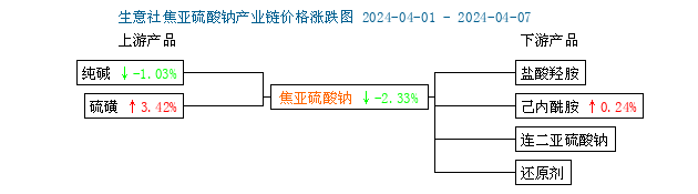 截至4月7日,國內(nèi)純堿價格偏弱運行,整體下跌1.03%,硫磺價格小幅回升,整體上漲2.80%,綜合來看,原料成本整體仍處低位,純堿價格跌幅有所放緩,原料成本震蕩前行,后市焦亞硫酸鈉價格弱勢有望企穩(wěn)。